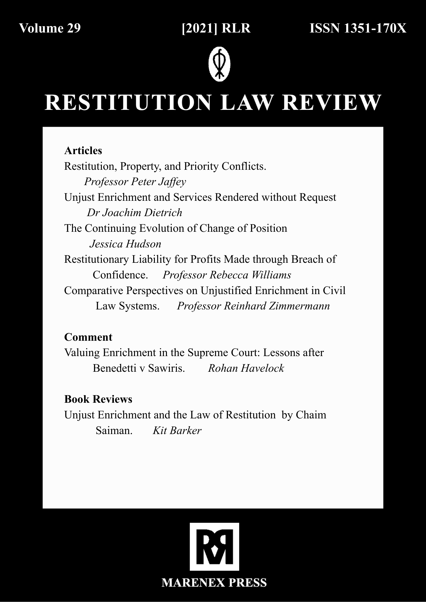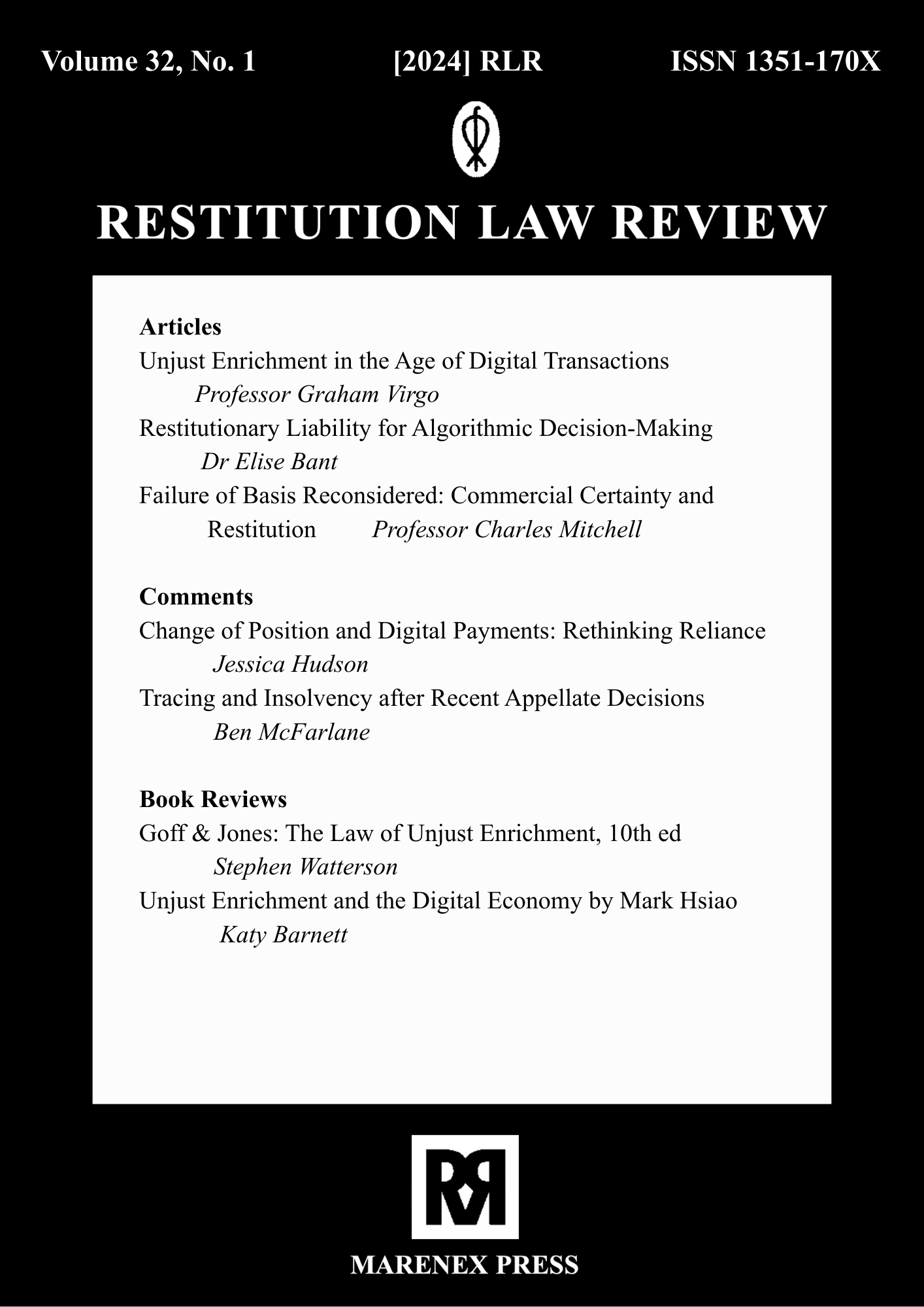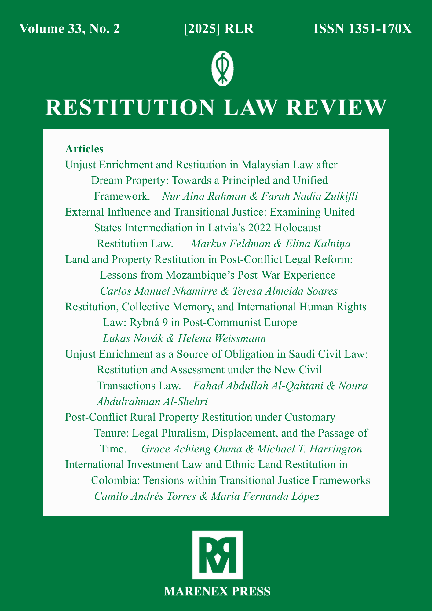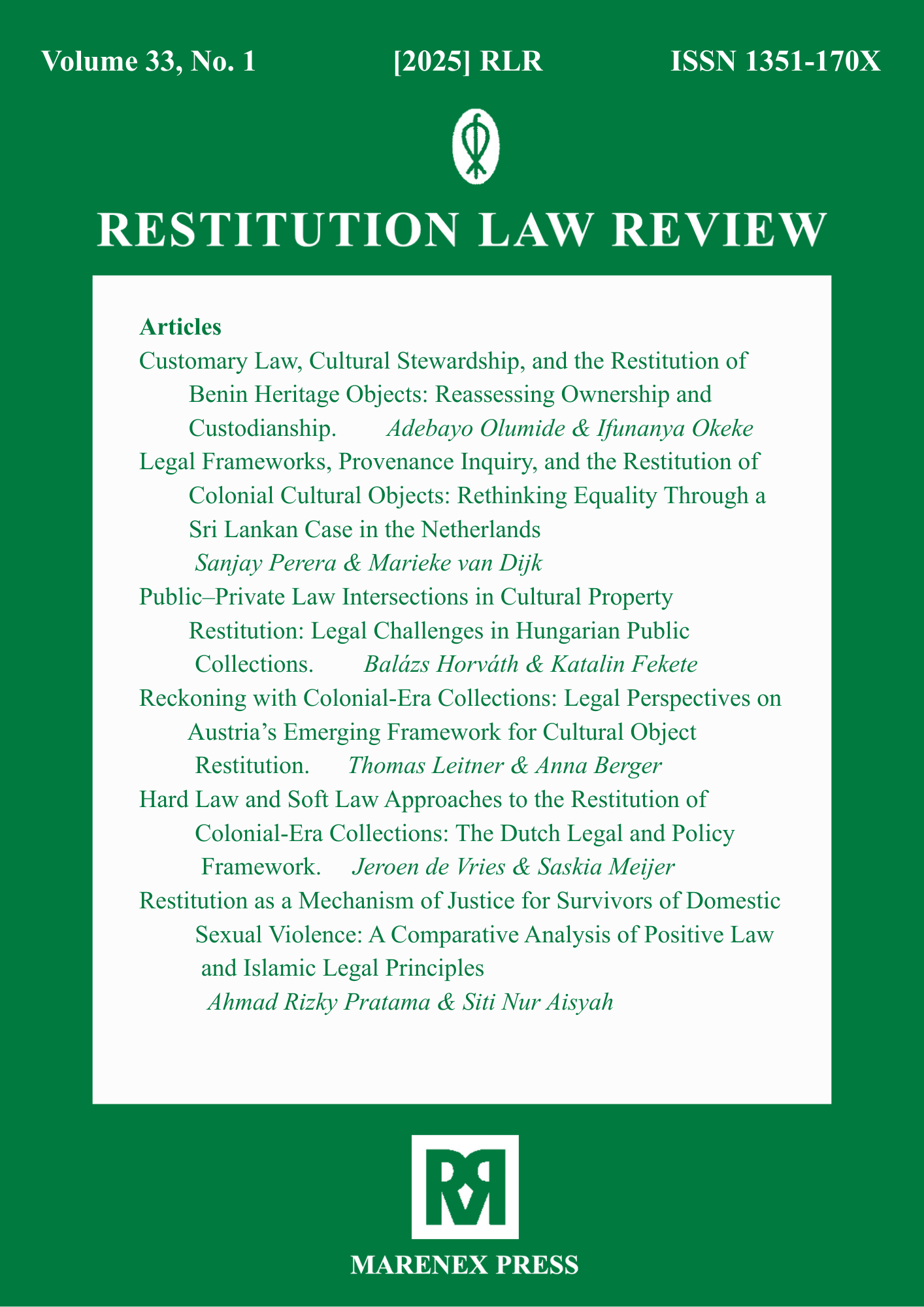 The earlier volumes of Restitution Law Review were published exclusively in print format and are available only as paperback editions through Marenex Press, United Kingdom. These archival issues are not available in digital or online format. Access to older volumes is limited to physical copies, subject to availability, and interested readers, libraries, or institutions may contact Marenex Press directly for purchase or further information regarding print availability.