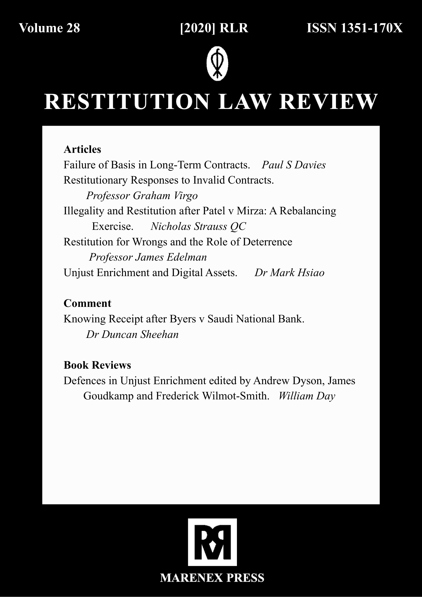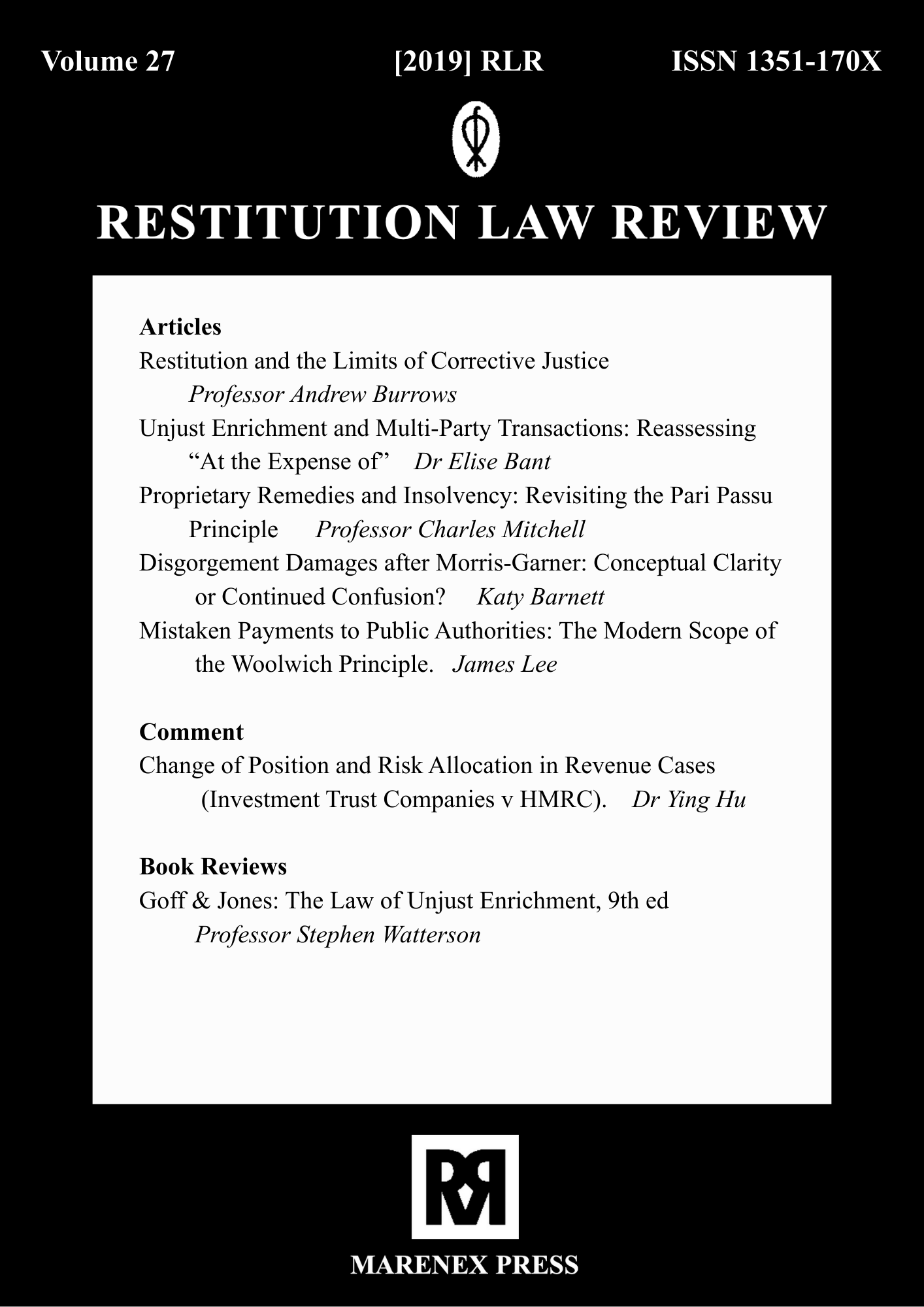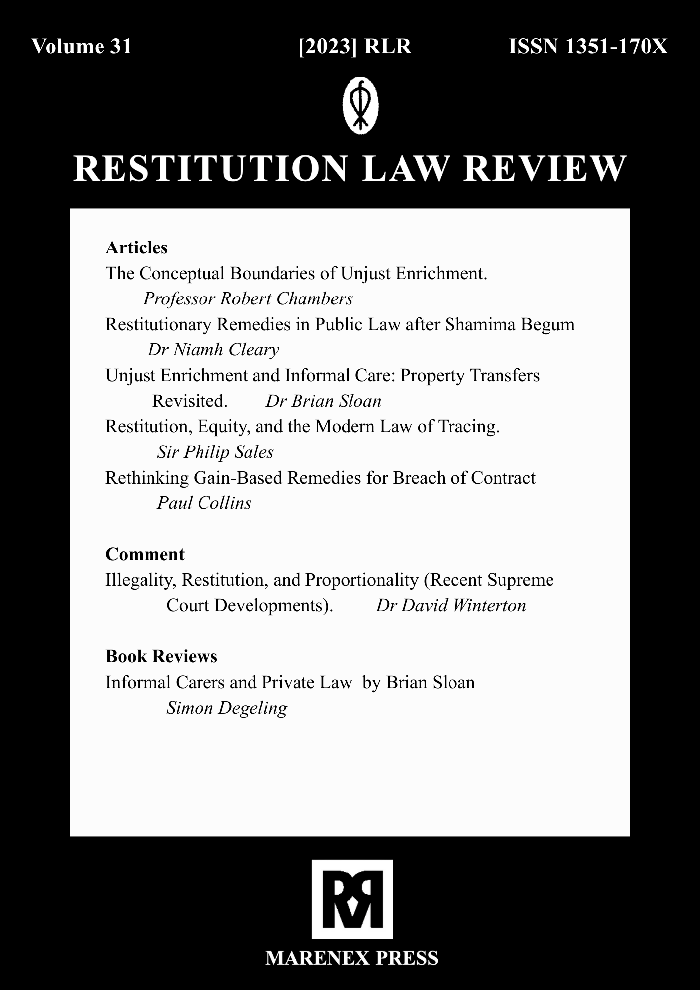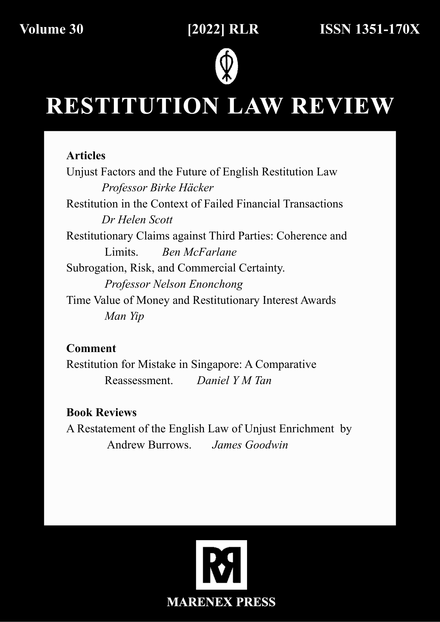 The earlier volumes of Restitution Law Review were published exclusively in print format and are available only as paperback editions through Marenex Press, United Kingdom. These archival issues are not available in digital or online format. Access to older volumes is limited to physical copies, subject to availability, and interested readers, libraries, or institutions may contact Marenex Press directly for purchase or further information regarding print availability.